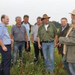 Wie Zusammenarbeit von Naturschützern auf lokaler Ebene funktioniert, das zeigten die Hallerndorfer Jagdgenossen bei einer Besichtigung eines Vorzeige-Blühfeldes am Ortsrand von Hallerndorf am 21. Juli. Drei Hektar Ackerland sind auf Initiative von Jagdpächter Johannes Seuberth für fünf Jahre in eine Blühwiese umgewandelt worden. „Es gehört schon auch ein wenig Idealismus dazu“, lobte er Landwirt Alfred Dormann, der seine Ackerfläche für das gemeinsame Projekt in Hallerndorf zur Verfügung gestellt hat. „Zusätzlich zu meinen vorgeschriebenen 5% an Greening-Flächen“, wie Dormann betont. Das Werben der Hallerndorfer Jagdgenossen und Imker für eine Erweiterung der bestehenden Blühflächen stießen beim größten örtlichen Landwirt auf offene Ohren. Die Maßnahme wird im Rahmen des Kulturlandschaftsprogramms gefördert. Bis zu drei Hektar pro Betrieb werden vom Freistaat bezuschusst. Abgeordneter Michael Hofmann war neben dem Imker-Kreisvorsitzenden Wolf-Dieter Schröber, dem Vorsitzenden der Hallendorfer Imker, Albert Bauer, sowie dem Hegeringleiter der Unteren Mark Hubertus Bauer eingeladen, sich vor Ort ein Bild vom neuen Vorzeigeprojekt in Hallerndorf machen zu können. „Wir möchten Akteure in anderen Ortschaften zeigen, wie Naturschutz auf unterster Ebene funktionieren kann“, erklärte Johannes Seuberth. Insgesamt sind in der Hallerndorfer Flur in den letzten drei Jahren mittlerweile 11 Hektar an zusätzlichen Blühflächen entstanden. Johannes Seuberth ist nicht nur der Jagdpächter, sondern selbst Imker und seit einiger Zeit Bio-Landwirt im Nebenerwerb. Daher kann er sich in die jeweiligen Positionen hineinversetzen. „Ein Vollerwerbslandwirt wie Alfred Dormann muss vom Anbau auf seinen Flächen leben können. Nebenerwerbslandwirte haben es da etwas einfacher“, gibt er zu bedenken. „Flächen für Blühwiesen zu finden ist meist gar nicht so einfach“, weiß auch der Imker-Kreisvorsitzende Schröber zu berichten. Er sagte: „Da nützen uns noch mehr runde Tische nichts. Aktionen vor Ort sind meistens am fruchtbarsten“. Der Abgeordnete Michael Hofmann freute sich, dass die Hallerndorfer Jagdgenossen mit dieser Aktion auf die möglichen Fördermaßnahmen im Freistaat aufmerksam machen. Mit Praktikern vor Ort sei vieles machbar. Vielleicht seien manche Fördermöglichkeiten noch immer nicht bekannt genug, daran will er gerne gemeinsam mit den lokalen Akteuren arbeiten. „Man muss auch darlegen, was jeder davon hat“, fügte Hegeringleiter Hubertus Bauer hinzu. Er hält die Schaffung von Blühflächen für ein wichtiges Thema, gerade auch für die Jäger: „Das Niederwild geht immer mehr zurück, Fasane sind bei uns fast nicht mehr zu sehen. Solche Flächen sind Nahrungs-, Brut- und Rückzugsräumen für viele Wildtiere.“ Jagdpächter Johannes Seuberth war sich zum Abschluss beim Blick auf die blühende Wiese mit Sonnenblumen, Margeriten, Phazelien, Wildkräutern und vielen mehr sicher: „Wir werden in der Hallerndorfer Flur noch einiges an Blühflächen schaffen. Immer in Zusammenarbeit mit allen Beteiligten. Da hat jeder was davon!“