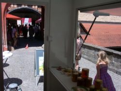 Nicht im Innenhof standen wir mit unserem Infowagen, sondern mitten auf der Brücke zur Kaiserpfalz. Jeder musste an uns vorbei. Ein idealer Platz Es war heiß. Kein Schatten. Unsere Präsentation der Imkerei im Landkreis Forchheim kam trotz gefühlten 40 °C an. Es begann mit dem Besuch unseres Standes durch die Presse in Begleitung von Herrn Bürgermeister Streit und der 1. Honigprobe an diesem Tag. Viele machten im Laufe der Veranstaltung bei uns halt und informierten sich über Honig, Diskussion mit einigen Imkern aus der Ferne war auch für uns hoch interessant und mit anderen Teilnehmer am Festival der Genüsse fand ein reger Austausch statt. Wenn man uns will, sind wir nächstes Jahr wieder dabei.
